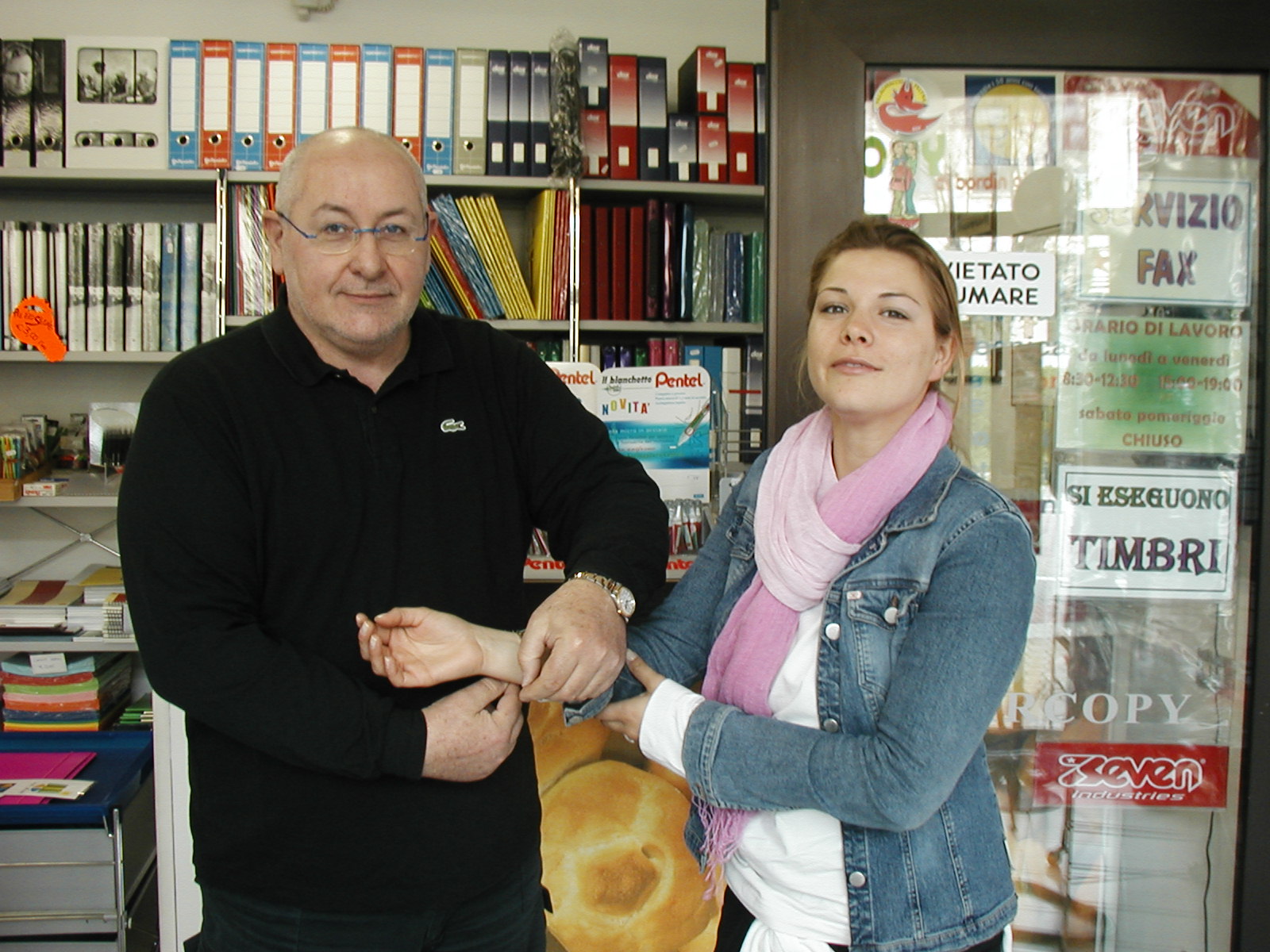 Il titolare in persona, uomo di stimata grandezza accorre e cerca di allacciare, a favor di fotocamera, il premio che la ns amica fatica a guardare da quanto luminoso e pregiato.