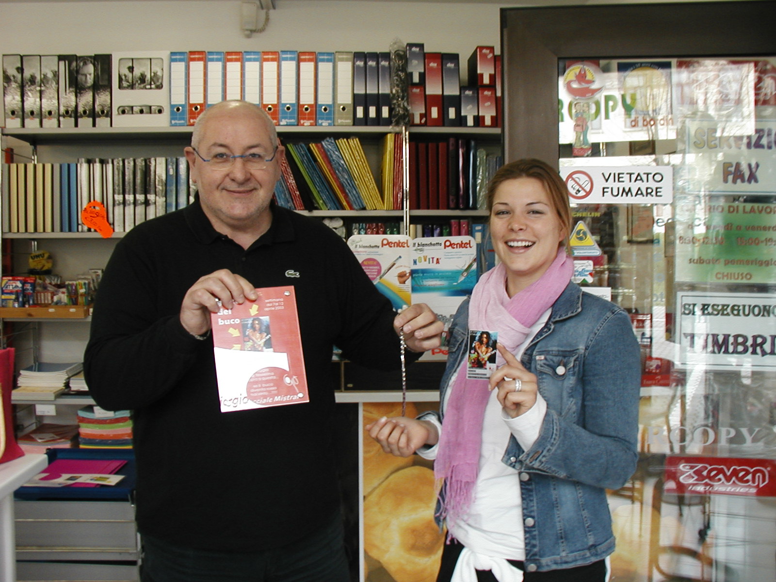 28.04.03 - 10.19 am. il titolare in persona, accorre a premiare la fortunata vincitrice con un prezioso gioiello di pregiate finiture, della ditta Mistxyz-- tutti i clienti in quel momento presenti rimangono esterrefatti, le ragazze che si strappano i capelli dall'invidia, tutte ad ammirare lo splendore e la lucentezza del dono ricevuto..